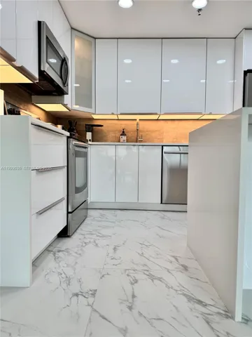 A stylish, modern oasis one block to the ocean with deeded beach access through the exclusive Altos Del Mar neighborhood of North Beach. Constructed in 1999, the building is an award-winning gem in the Miami Modern architectural style. Unique apartment in many ways: 11-foot ceilings provide an ample feel to an efficient open split floor plan, en-suite bedrooms on either side with walk-in closets. The only ground-floor unit in this building, with two adjacent parking spaces steps from the front door, and personal EV charger giving townhome feels and utmost convenience. Massive private patio completes this home, designed for easy living and entertaining. Meticulously renovated, featuring, double-glazed impact windows and doors, motorized shades, Italian porcelain floors, quartz counters, abundant storage and newer appliances. Pet-friendly building has pool, exercise room, bike and kayak storage, secure access gates and video surveillance. Your chance to get the best slice of Miami Beach.