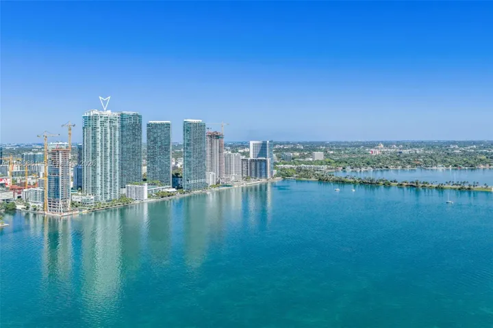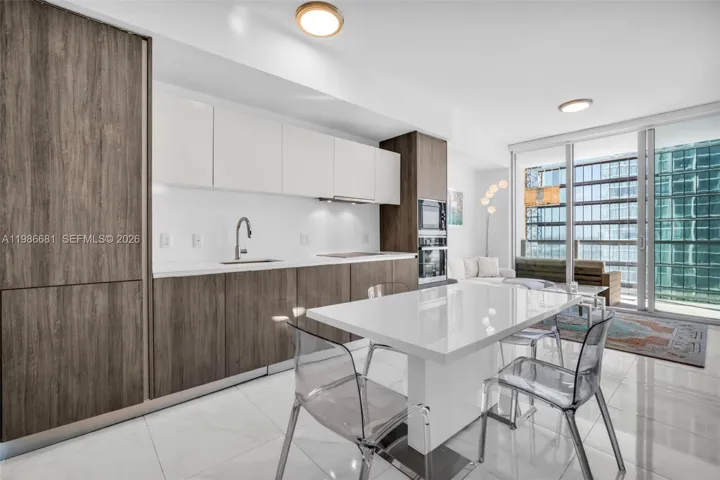 Beautiful 1BD/2BA in Edgewater with sweeping bay and city views through floor-to-ceiling windows and sleek porcelain tile floors.