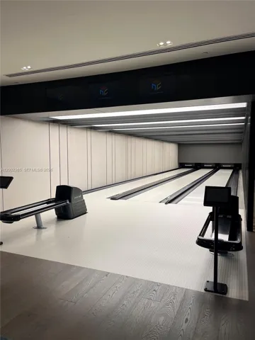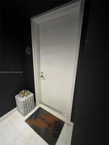 The residence boasts breathtaking views of Biscayne Bay and the city skyline, highlighted by floor-to-ceiling windows and a private balcony. Interior features include elegant porcelain tile flooring, a spacious primary bathroom with dual sinks and a soaking tub, and a sleek Italian-designed kitchen with premium appliances. A semi-private foyer adds an extra touch of exclusivity.