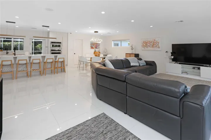 The fully updated kitchen is a showstopper, complete with quartz countertops and a stunning waterfall island, bar seating, KitchenAid stainless steel stove, double dishwasher, double sink, and a convenient pass-through window—perfect for seamless indoor-outdoor entertaining.
