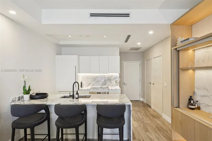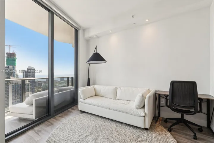 Experience elevated living at SLS Lux Residences, where refined design, full-service luxury, and an unbeatable Brickell location converge. Perched on the 49th floor, this south-facing residence offers panoramic views of the Miami skyline and Atlantic Ocean, enhanced by 10-foot ceilings maximizing light and scale. Enter via private elevator into a curated 2-bedroom plus den, 2.5-bath home, offered fully furnished with interiors by The Curated Group. Every detail reflects thoughtful upgrades and finishes, creating a turnkey residence of exceptional quality. The home features a reimagined kitchen with custom marble countertops and backsplash, upgraded fixtures, and sleek cabinetry. The living space is anchored by a custom-built bar, ideal for entertaining, complemented by bespoke millwork and designer furnishings for a warm, sophisticated feel. Custom lighting enhances architectural detail and ambiance. The den is a statement office with custom millwork and marble accents, while bedrooms feature remote-controlled blackout shades for comfort and privacy. Residents enjoy hotel-style amenities including a resort-style pool with on-site dining, rooftop pool, fitness center, spa, and exclusive SLS services. Located steps from Brickell City Centre, Mary Brickell Village, and top dining and nightlife, this is a rare opportunity to own one of the most thoughtfully designed homes in the building. No active special assessments. Settlement completed in 2025.