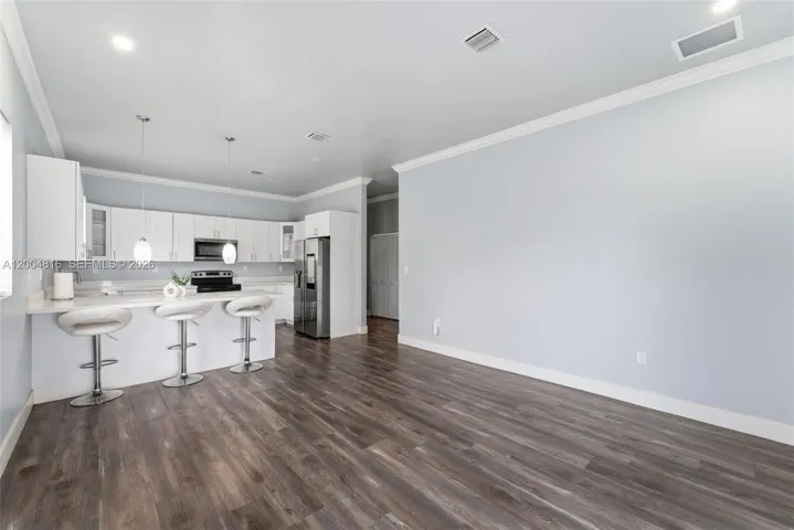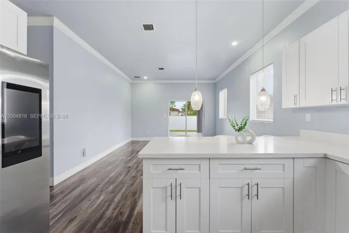 This 3-bedroom, 2-bathroom home features 10-foot ceilings, crown molding, and an open-concept design with expansive living and family areas. The kitchen includes quartz countertops, stainless steel appliances, and a large L-shaped layout that flows seamlessly into the main living space.