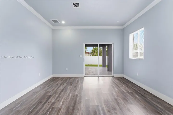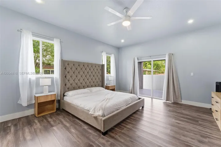 The primary suite is generously sized with room for a sitting area, a walk-in closet with custom wood shelving, and direct access to the covered patio through impact sliding glass doors. All additional bedrooms are also well-proportioned.