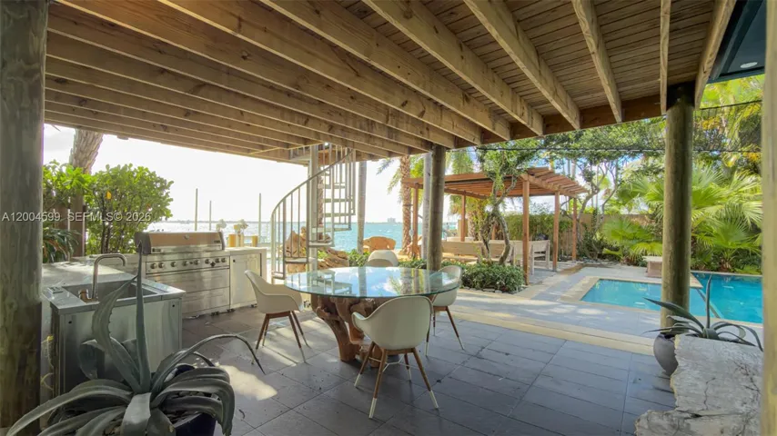 Built in 2015, the home offers approx. 3,442 SF with 4 bedrooms and 4 bathrooms. The layout flows through open living and dining areas into a modern kitchen designed for both function and entertaining. From the moment you arrive, the home creates a calm feel. A bamboo garden welcomes you, leading to a striking 30 ft interior waterfall that sets the tone throughout. The outdoor space is built to enjoy. Lush landscaping surrounds a pool, outdoor kitchen, and multiple terraces. Relax in the outdoor soaking tub, host gatherings under the two story tiki hut, or enjoy quiet evenings by the water. The private dock allows you to take in the bay at sunset.