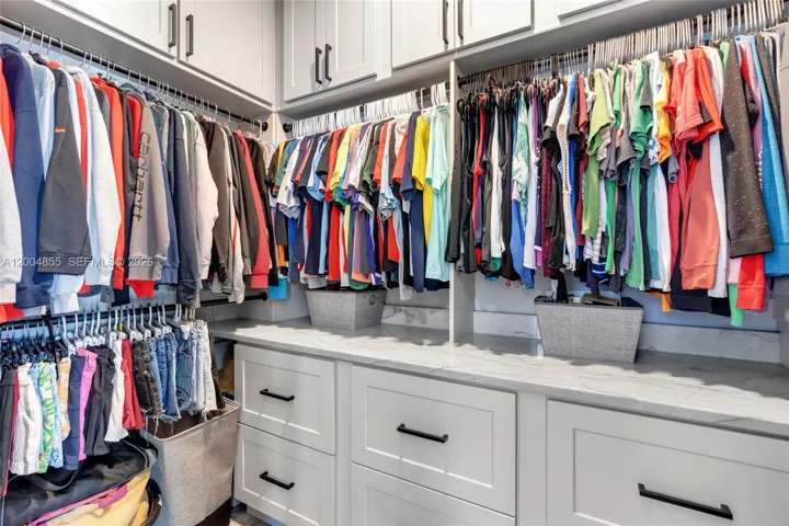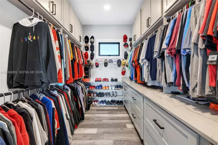 The home features 3 oversized bedrooms, a private office, a theater/flex room with bar, and 4.5 bathrooms. Each bedroom includes an en-suite bath, while one guest suite offers a private washer and dryer—ideal for extended stays or multigenerational living. The chef’s kitchen impresses with a pot filler, two waterfall-edge islands with seating for eight, and a walk-in butler’s pantry with a second dishwasher—perfect for entertaining. Motion-activated kick lighting and dimmable lighting enhance ambiance throughout. Built for durability and efficiency, the home includes hurricane-impact windows and doors, Icynene insulation, a whole-home reverse osmosis system, and a Fuji septic system.