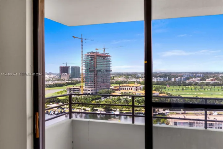 Experience breathtaking sunsets from this magnificent split-floor plan residence at the prestigious Olympus Condo in Three Islands—an exclusive, private waterfront community just minutes from the beach, shopping, and dining. This spacious 2-bedroom, 2-bathroom residence is currently configured as a 1-bedroom + den, with an easy conversion back to a full 2/2. Enjoy 180° unobstructed views of the canal, marina, Diplomat Golf Course, and city skyline from a bright, open layout filled with natural light. The unit offers exceptional storage, including walk-in closets.