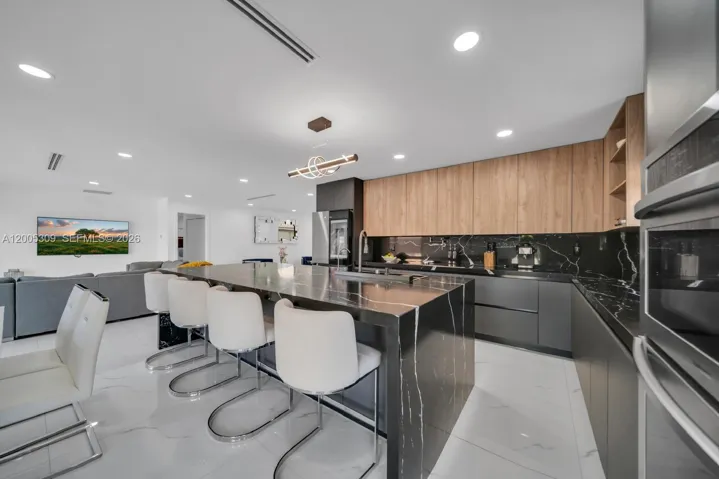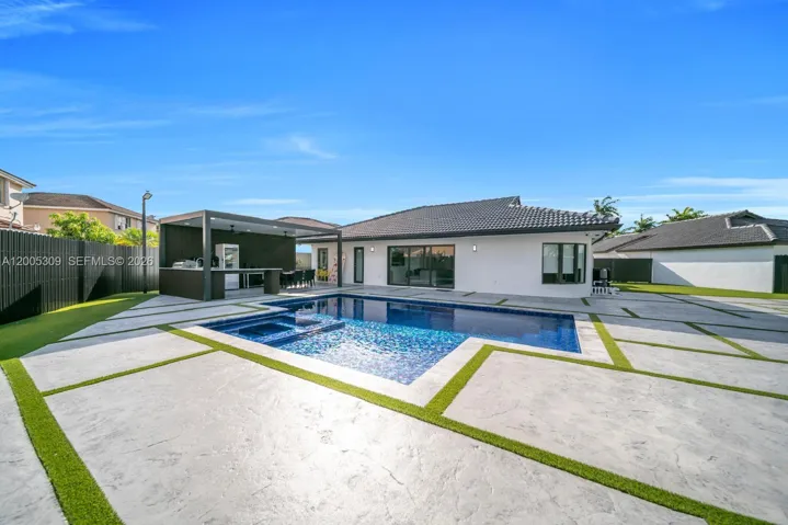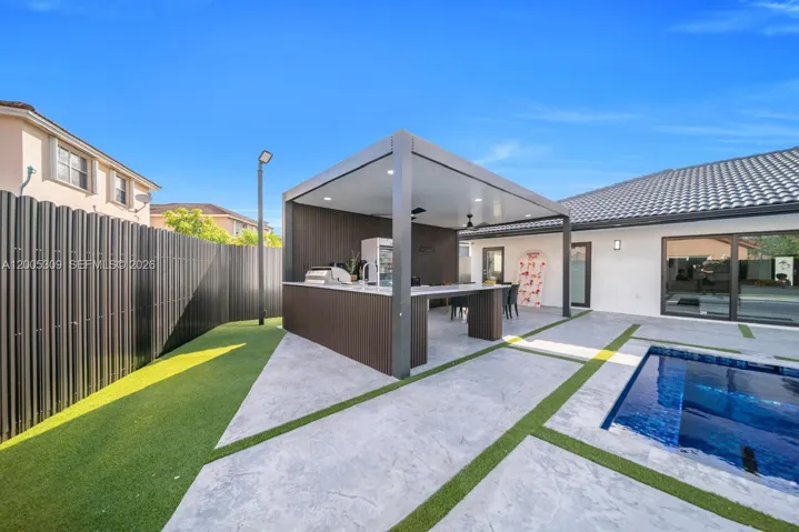 Exceptional 6-bedroom, 4-bathroom home offering more living space than the tax roll, plus an office/den, storage room, and 1-car garage, all situated on an oversized 10,400+ sq ft lot. Completely redone in 2024, the home features large porcelain tile flooring, a stunning kitchen with designer wood cabinetry, a quartz island, and premium appliances. All four bathrooms have been beautifully renovated with high-end finishes. The home also features recessed LED lighting, two 3.5-ton new central AC units, full impact windows and doors, and a new metal fence with a back entrance door, great for guest access during parties. The backyard is an entertainer’s dream. Step outside to a newly finished heated pool, a massive concrete patio, and a designer outdoor retreat boasting a fully equipped chef’s summer kitchen with marble counters, slat-wall detailing, and an insulated all-weather roof. This is an unbeatable location with easy highway access for effortless commuting – just minutes from Miami International Airport and South Beach, and close to Dolphin Mall and Doral.
