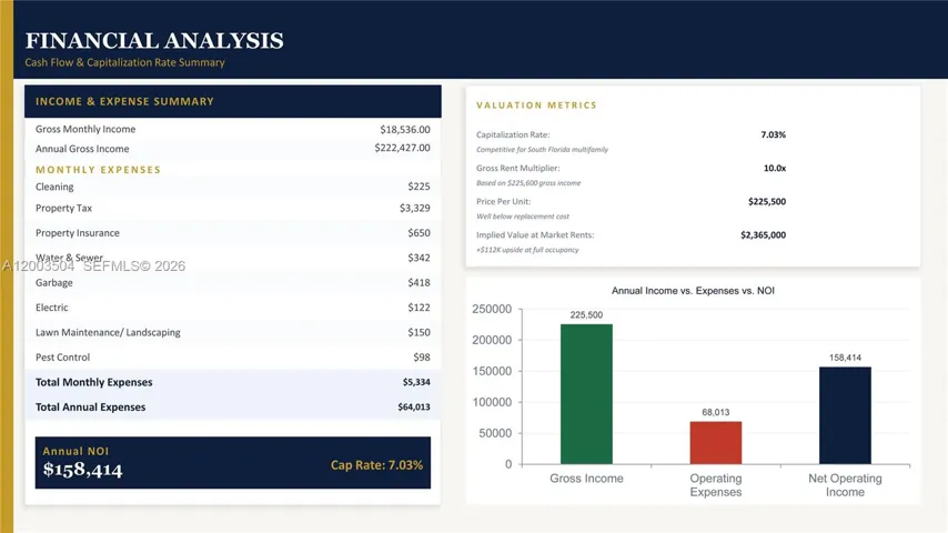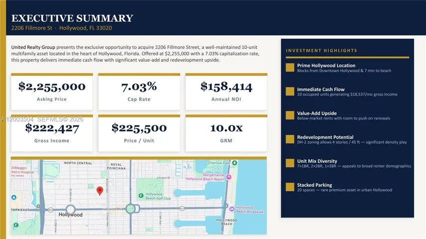 Rarely available 10-unit multifamily property in the heart of Hollywood, Florida — fully occupied, cash-flowing from day one, and priced extremely competitively. Comprising two well-maintained buildings totaling 7,445sq.ft. on a generous 20,060sq.ft. lot, this asset delivers immediate NOI of $158,414 annually, 7.03% Cap Rate and meaningful rent upside still on the table. The unit mix — seven 1BR/1BA, two 2BR/1BA and one 3BR/2BA — attracts a broad renter demographic, reducing vacancy risk across market cycles. Both buildings received a new roof and new wall AC units, dramatically reducing near-term capex exposure and making this a true turnkey acquisition. The location is exceptional. Situated just blocks from Downtown Hollywood’s vibrant ArtsPark and restaurant corridor, and only 7 minutes from the award-winning Hollywood Beachfront Broadwalk, demand for rentals here is structural and persistent. Fort Lauderdale–Hollywood International Airport (FLL) is 15 minutes away, and easy I-95 access puts Miami in 25 minutes and Boca Raton in 30 minutes. Zoned DH-2, the site permits up to 4 stories and 45 feet in height — giving a future owner optionality to redevelop at higher density as Hollywood’s Downtown corridor continues its rapid appreciation trajectory. Twenty stacked parking spaces are a premium differentiator in this urban submarket. For more information and to schedule a showing, please call today!