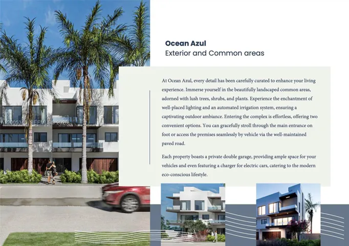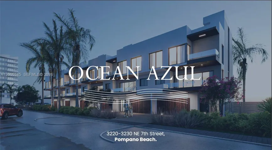 Welcome to Ocean Azul, an exclusive collection of six luxury townhomes in Pompano Beach, Florida. Experience the epitome of refined living with modern architecture, exquisite interiors, and breathtaking rooftop terraces. Ranging from 2498 to 2553 Sq Ft, each townhome offers spacious living areas, three bedrooms, three full bathrooms, one half bathroom, elevator and a two-car garage. Expected completion end of Q2 2026.