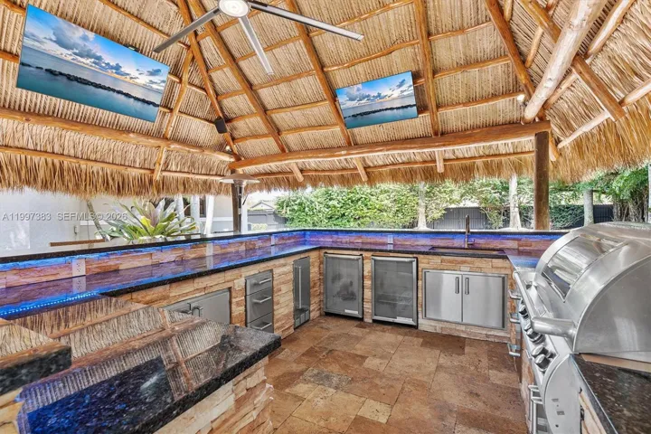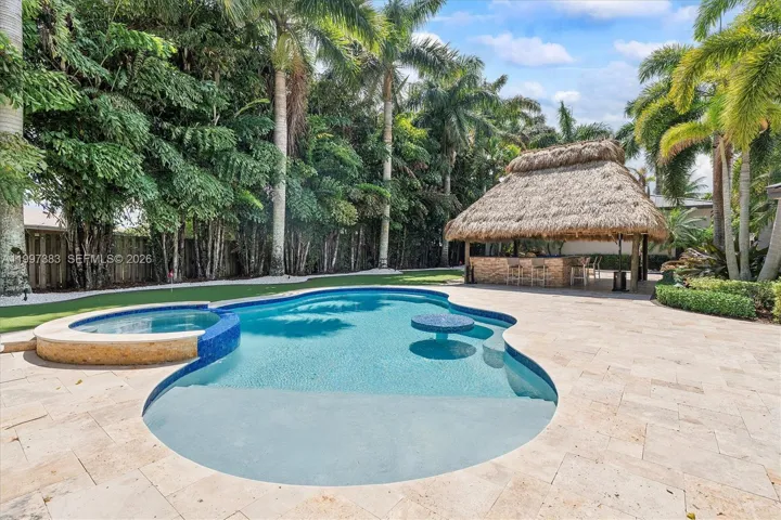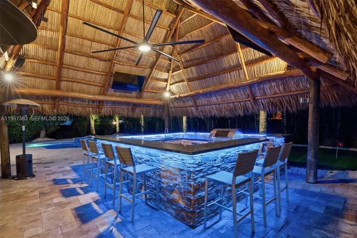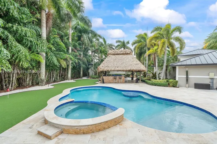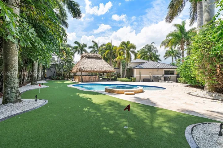 The backyard is a resort-level retreat featuring a heated pool/spa with beach entry (2025), a custom rock waterfall featuring its own dedicated wading pool which then flows into the primary pool, and a 25×25 rethatched tiki hut. Entertain with a Sonos 10-speaker system, putting green, and an outdoor kitchen boasting Blue Sapphire granite & FireMagic appliances. Car enthusiasts will marvel at the 1,250 sq ft climate-controlled workshop with a professional car lift and high-gloss floors.
