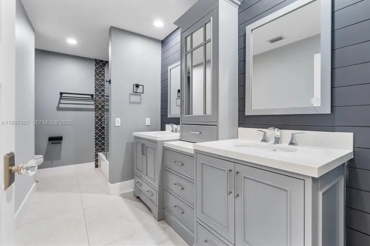 The chef’s kitchen is a masterpiece, featuring Arctic White granite with waterfall edges, a 10-foot island, KitchenAid professional appliances, and a custom bar. Smart home technology abounds with WiFi dimmers, Ring security, and hardwired access points. All bathrooms are fully updated with Carrara marble, custom wood vanities, and Bluetooth systems. Custom-built TV wall in family room. 5 A/C units, 2 Carrier and 3 mini-splits (garage unit new 2023, 2 in warehouse are existing).