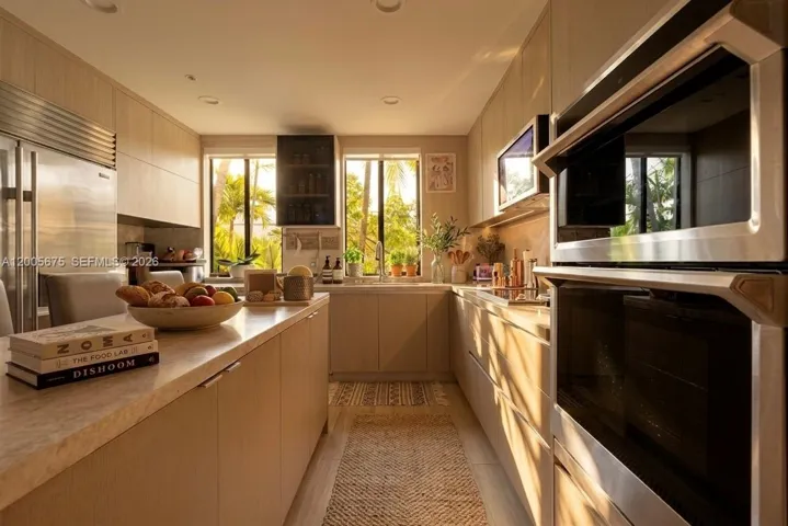 Discover refined island living at The Villas at Bay Harbor, an intimate gated community of only 18 townhomes tucked into the heart of Bay Harbor Islands. Completely reimagined in 2022 and delivered fully furnished with designer selections, this 4-story townhome offers 2,675 SF of sophisticated living, converted-5 bedrooms, 4 bathrooms, and the rare convenience of a private interior elevator servicing every floor. The entry level welcomes you with a versatile den and full bath — effortlessly converted to a 5th bedroom — opening onto a tranquil outdoor patio. Ascend to the second floor, where a brand-new chef’s kitchen anchored by marble countertops and a generous center island flows gracefully into the light-filled living and dining areas. The third level hosts three well-appointed bedrooms and two baths, while the entire fourth floor is reserved for an expansive primary suite featuring a walk-in closet and a private rooftop terrace — an ideal perch for sunrise coffee or evening cocktails. Residents enjoy access to a renovated rooftop pool and fitness center. Ideally positioned just moments from the beach, world-class shopping at Bal Harbour Shops, celebrated dining, houses of worship, and the A-rated Bay Harbor K-8 Center.