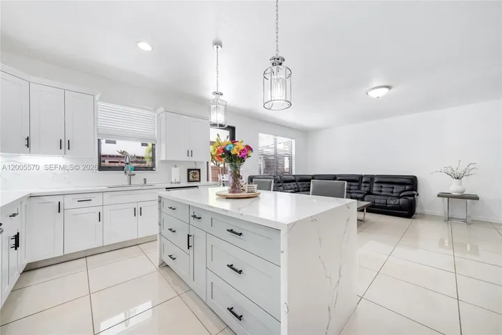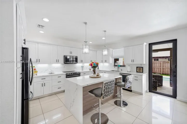 Enjoy a large, open kitchen equipped with stainless steel appliances, a wine fridge, abundant cabinetry, and a generous breakfast island that flows seamlessly into the expansive family room. Ceramic tile and laminate wood flooring run throughout, adding both style and durability.