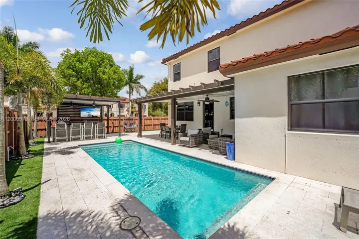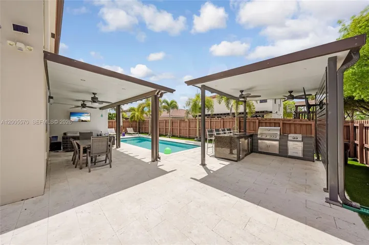 Step outside to your private backyard oasis situated on a large corner lot. The outdoor space boasts a sparkling pool, a spacious patio with a pool deck, and a covered outdoor kitchen complete with exterior fans, ideal for year-round entertaining.