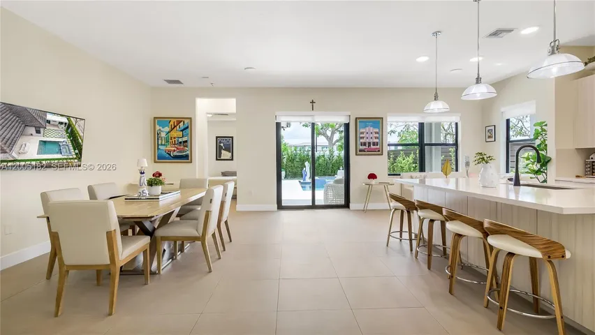 Inside the home features hight ceilings and abundance natural light, creating a bright, open atmosphere throughout. The kitchen is enhanced with custom built-in seating, adding both style and functionality perfect for casual dining and entertaining.