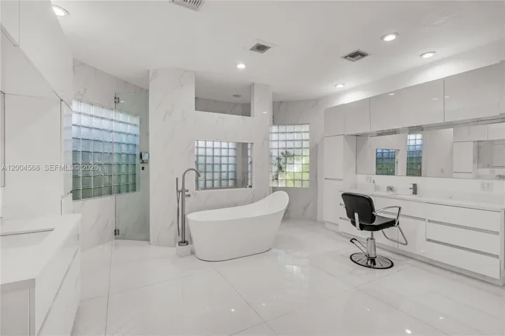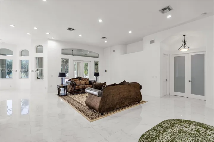 Beautiful waterfront estate in the prestigious gated community of Emerald Springs Estates. Huge open great room floor plan. 5 large bedrooms (all 5 suites), plus two office dens, 6 bathrooms, formal living room, family room, also a Florida room, gas range, stainless steel appliances, wood burning fireplace. Entire rear of house is glassed for ultimate view of the infinity pool (heated), rock water falls and spa, lake front, whole house generator, solar panels, extended 3 car garage, rolladen shutters, full alarm with built in camera system, speakers throughout great room, patio and pool area, and lush landscaping. Pool and lawn maintenance are included in the price. Available for 6-12 month lease with option to renew long term.