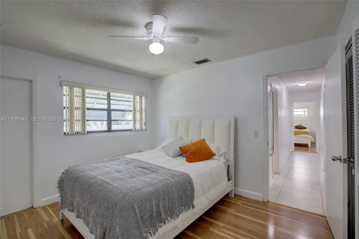 The home offers modern-style bathrooms, tile flooring throughout the main living areas, and wood flooring in the bedrooms. One bedroom includes a private entrance, ideal for guests or added flexibility.