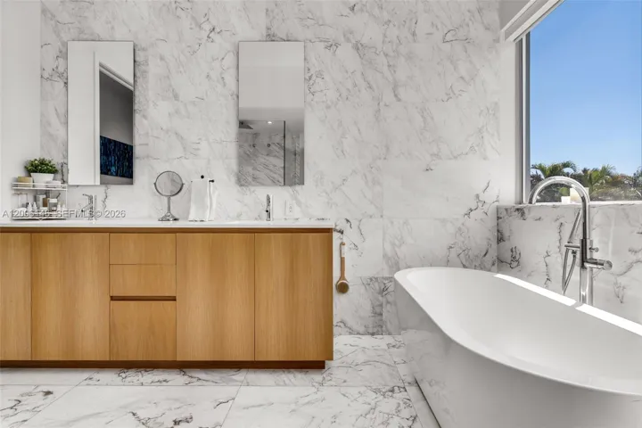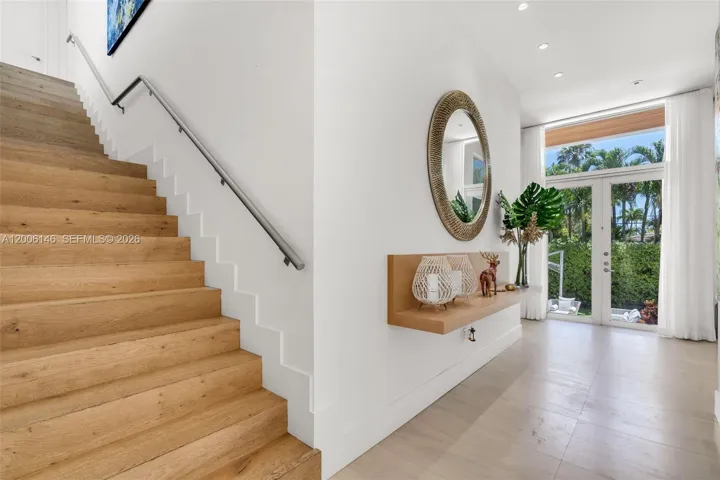 Situated on a unique 8,125 SF oversized lot, this modern 6-bedroom, 5-bathroom residence plus powder room offers a compelling combination of space, privacy, and strategic positioning in Key Biscayne. Built in 2017, the home is located at the end of a quiet street, with no direct front neighbor—an uncommon feature that enhances both privacy and curb appeal. With 3,964 SF of living area under A/C, the layout is thoughtfully designed for functionality and comfort. The home features 6 bedrooms, including 4 en-suite, plus 2 additional bedrooms connected by a Jack & Jill bathroom, offering flexibility for family living or guests. High ceilings, impact windows, and abundant natural light define the interiors. Marble flooring on the main level and hardwood floors upstairs add warmth and contrast to the clean, modern design. The open layout seamlessly connects indoor spaces to a spacious covered terrace and pool area, creating an ideal indoor-outdoor living experience. Electric blinds throughout provide convenience and effortless control of natural light, complemented by multiple upgrades that enhance both comfort and functionality throughout the home. Located just steps from one of Key Biscayne’s top-rated schools, this property offers scale, design, and a highly desirable location—an increasingly limited opportunity in today’s market. A thoughtfully designed residence that stands out for its scale, privacy, and positioning—rarely found in Key Biscayne.