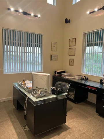 Welcome to Kendall-Tamiami’s Premier Penthouse Office space. Located on the main artery connector to 874 Don Shula, Turnpike & Miami Executive Airport. Original owner with no expense spared in design and layout. This Office space presents itself as the nicest in the entire complex with regards to placement, views and layout. As you arrive to your office, access your entrance via staircase or Elevator. The walkway towards the Office is open and welcomes a beautiful lake view. As you enter your spacious marble floor adorned waiting area, you will notice a reception window and secured privacy entry way. Once inside you will notice freshly polished Crema Marfil Marble floors, a long hallway leading to 6 glass enclosed office spaces plus a large conference room w/ balcony & open lake views purposely designed such that every office space provides stunning lake and sunset views. Loft style volume ceilings soaring 11-17’ high throughout. Custom Bruck & Sistemalux lighting throughout. Kitchen area w/ sink & refrigerator. The large 2.2k sqft space features a full Marble bathroom w/ custom glass enclosed Grohe massage jetted shower and a second marble floor to ceiling half bathroom. Security, lights, HVAC & High end sound system throughout all controlled by a Smart Crestron Automation system. Hurricane impact windows and doors. Prime picked 7 deeded parking spaces (2 Covered). Brand new Roof in 2024. HOA completely renovated complex ($750k). Assessment fully paid. Priced to sell fast.