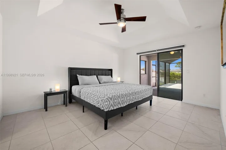 Inside, the home features tile flooring throughout, high ceilings and an open split-bedroom floor plan. The kitchen includes granite tops, stainless appliances, an island with breakfast bar and water views. The primary suite offers lanai access, canal views, two walk-in closets and an en-suite bath with dual sinks and tiled shower.