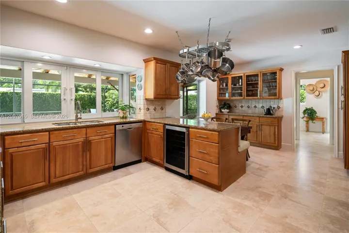 This exceptional 4-bedroom, 2.5-bath home is ideal for comfort, entertaining, and outdoor living. Ideally located near top-rated public and private schools, parks, shops, and bike paths, it is tucked away at the end of a quiet cul-de-sac with minimal road traffic. The spacious primary suite features his-and-hers walk-in closets and an en-suite bath with dual sinks, dual shower heads, and a separate tub. The large kitchen boasts wood cabinetry, granite countertops, and a generous breakfast nook. The open living, dining, and family areas offer easy flow, with disappearing sliding glass doors connecting indoor and outdoor living. Step outside to a covered screened enclosure that helps keep bugs out and enjoy the large patio—perfect for entertaining—with its built-in grill and bar and easy access to the kitchen, plus a sparkling pool for relaxing and fun. The fenced backyard provides added privacy. The home also includes a dedicated laundry room with cabinetry and a utility sink. All windows and doors are impact-resistant, and the home has a concrete tile roof (2019).