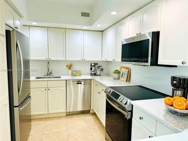 Partial ocean views from a generous balcony on Collins Avenue. This two-bedroom, two-bath residence at 5600 Collins has been thoughtfully updated — porcelain floors throughout, a remodeled kitchen with quartz countertops and new stainless steel appliances, high-impact windows in the bedrooms, and an in-unit washer and dryer.