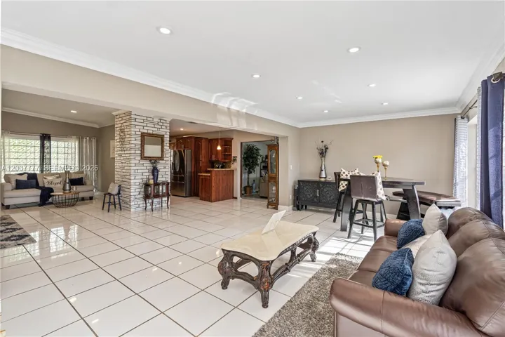 Interior spaces include a spacious open living room with a white brick fireplace, seamlessly connecting to a sunlit Florida room offering expansive pool views. The kitchen is appointed with granite countertops and stainless steel appliances, while the adjacent family room provides a comfortable secondary living area. Bedrooms are positioned on a split level and feature wood flooring.