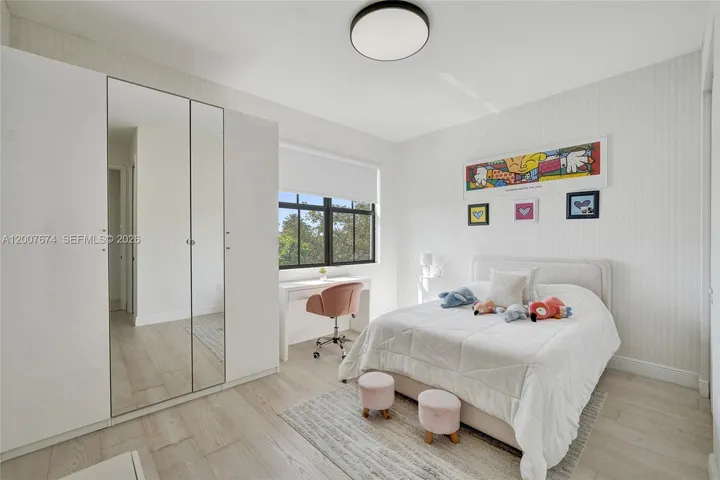 The first floor offers porcelain tile throughout, a spacious living area, and a fully remodeled white kitchen with modern appliances, including a double-door refrigerator, stovetop, and built-in microwave. A first-floor bedroom and full bathroom provide flexibility for guests or a home office, with a Murphy bed included.
