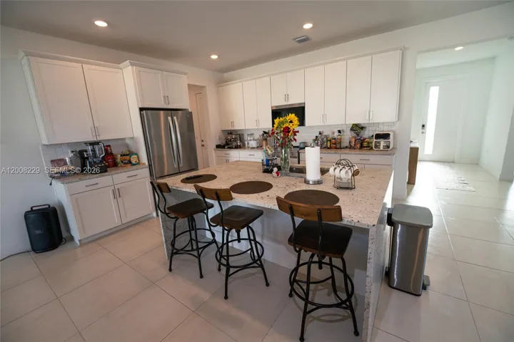 The contemporary kitchen features stainless steel appliances and an elegant cascade-style island, with direct access to the pantry, laundry room, and garage. The split layout places the primary bedroom on one side of the home for added privacy, while the remaining bedrooms and bathrooms are located on the opposite wing.