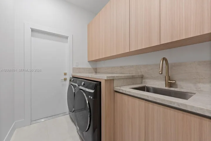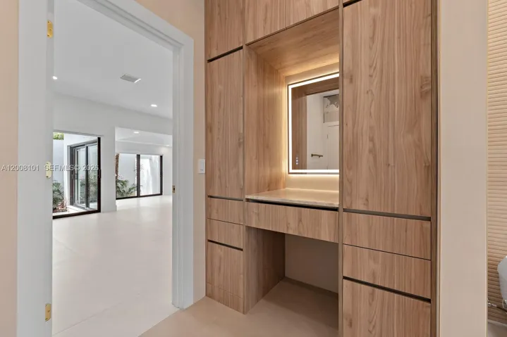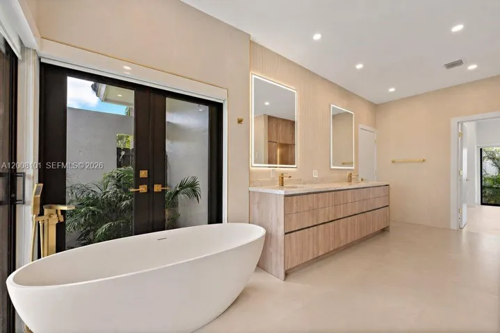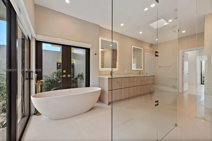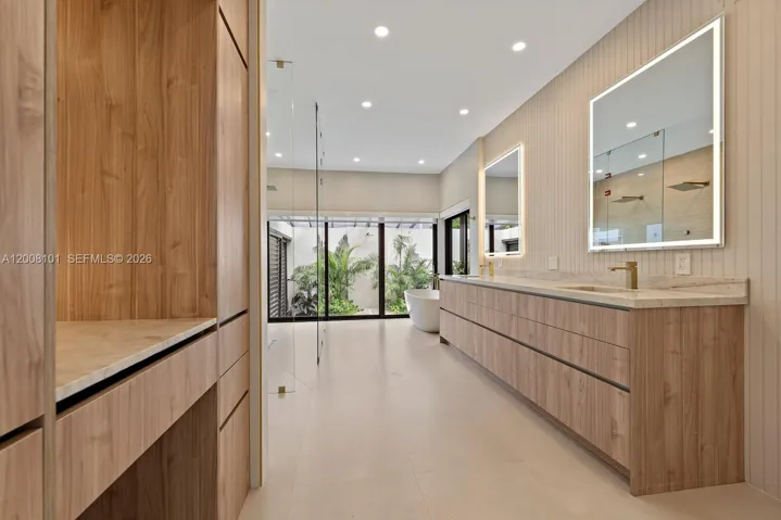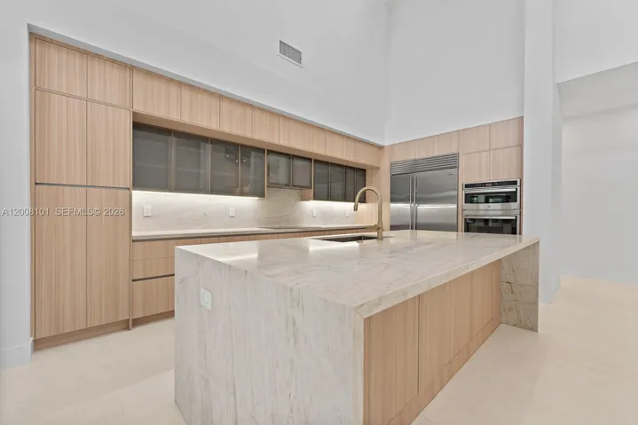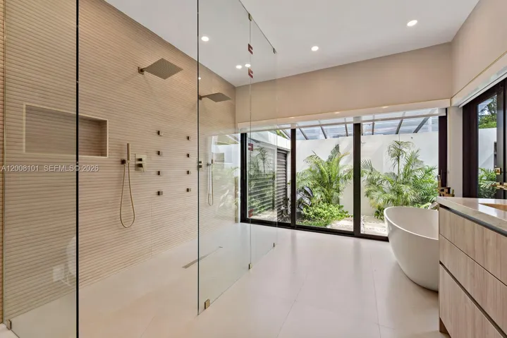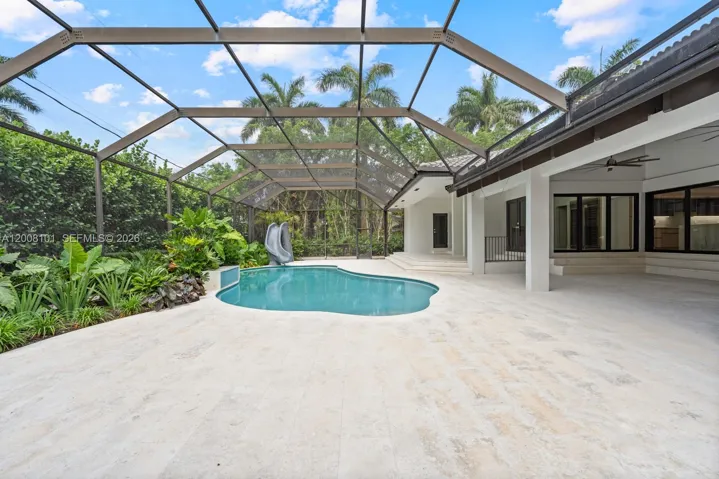 A masterclass in modern design, this fully remodeled single-story estate sits on nearly half an acre behind gates, offering exceptional privacy and exclusivity. Soaring 40+ ft ceilings define the grand great room, where expansive sliding glass doors create seamless indoor-outdoor living. The home features 6 en-suite bedrooms and 6.5 bathrooms, including a luxurious primary suite with walk-in closets and a spa-inspired bath with outdoor shower and tranquil zen garden. Designer finishes elevate the interiors, with a chef’s kitchen appointed with Sub-Zero appliances, leathered quartzite countertops, and custom cabinetry. Outdoors, a resort-style setting unfolds with a pool, slide and waterfall, expansive entertaining areas, a fully equipped summer kitchen, and a private basketball half-court.