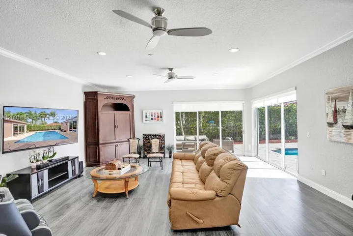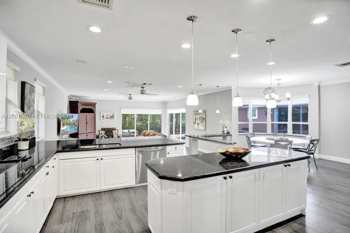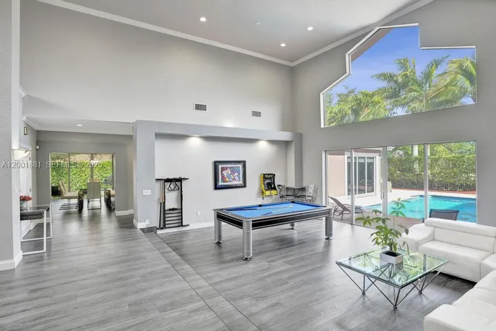 As you enter the home, you are struck by tall cathedral ceilings and a dramatic peaked window that frames the pool in the great room. The updated kitchen features white cabinetry, granite counters, an oversized island, stainless appliances, and a bay window overlooking the pool, flowing seamlessly into the dining and family rooms.
