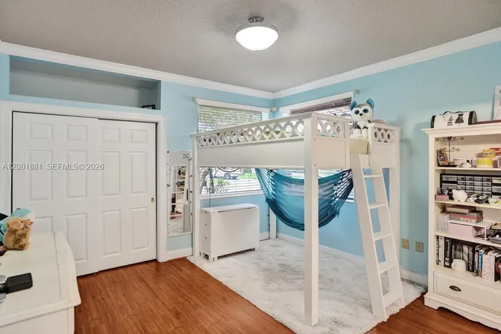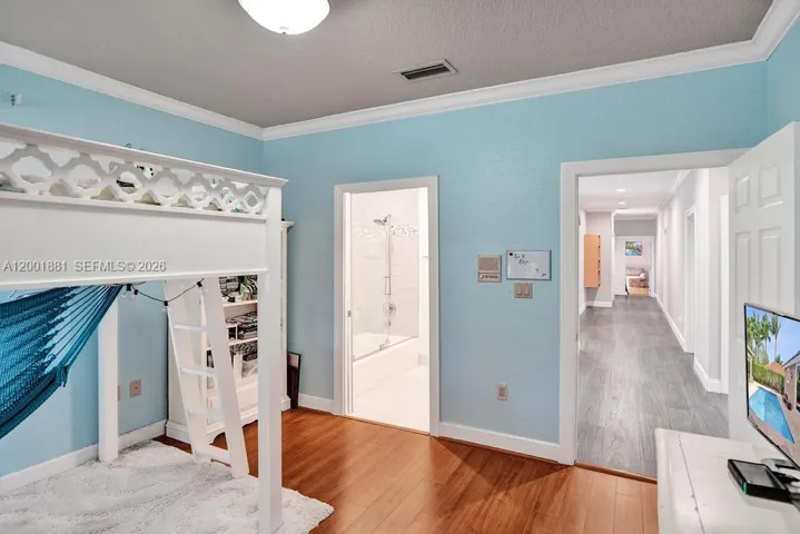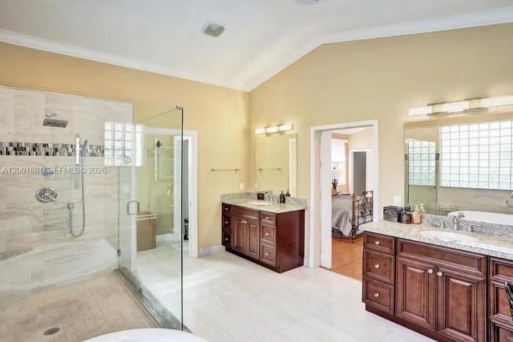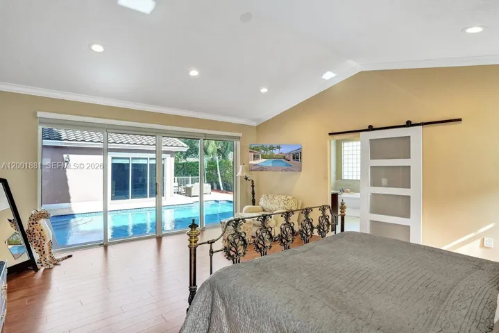 All bedrooms and bathrooms sit together on one side of the home. No split layout separating you from the kids. The primary suite offers vaulted ceilings, an upgraded spa-like bath with a frameless glass shower and dual granite vanities, and sliding doors that open directly to the pool deck.