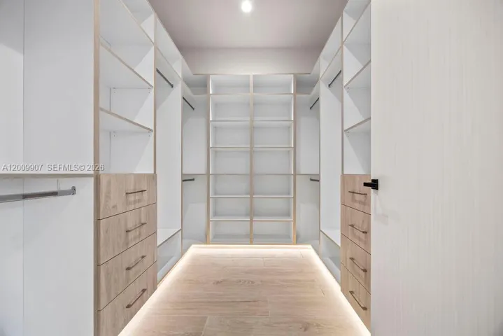 The kitchen features a sleek combination of glass, white, and light wood finishes, complete with panel-ready JennAir appliances and a spacious island that overlooks the main living areas. Built-out closets throughout the home provide functional and efficient storage solutions.